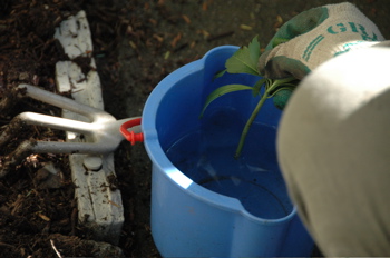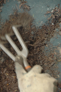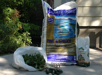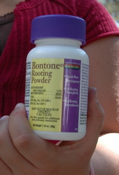 MaterialsHere again is the bag of cuttings, harvested on August 21, 2007 fromRooting medium, Bontone my parents’ yard, bundled in a sealed white, unscented garbage bag with about 1/2 cup of water, and put aside for a while in a spot out of the sun. For materials, I recommend a bag of mulch and a few pounds of an organic soil enhancer like potash. Also, have ready a sharp knife, a small garden claw, water in a small pail, a stick, and some rooting powder and a paper cup to put it in.