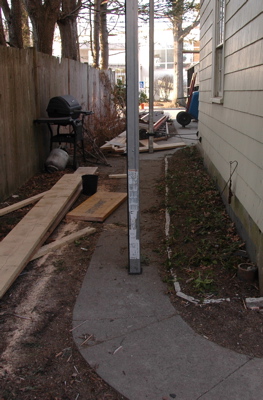 Flash forward to today: Now they’re trampled, knocked over, torn, dug up, and gone missing in places. Our house is undergoing what, for us, is a dramatic transformation — we’re adding a bedroom over the garage and redoing the rest of the second floor — and the builders and their staging are taking over the pachysandra’s territory.