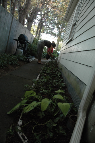 Tending pachysandra, September 2007In September, I wrote (pridefully) of how I propagated and planted 100 pachysandra cuttings from my parents’ yard into mine. Within a couple of weeks, the cuttings had taken root and appeared sturdy. Over the winter, I checked on them from time to time, when they weren’t blanketed by snow. They drooped, yet remained green and leafy. I anticipated their spring return to robustness.