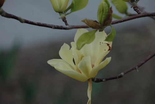 The magnolia in the front yard, planted and staked seven years ago by Colleen (gardener/artist) and coaxed, watered, fertilized, and generally clucked over by me, had finally — finally! — burst into yellow bloom. I’ve been waiting.