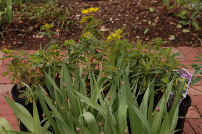 Sunday I strolled the section of yellow-flowered perennials at Allandale until I spotted a twin to my mystery Euphorbia; it’s a ‘Polychroma’. Lovely — yellow in the spring and reddish in the fall. (If only all plants could pull off that color change.) I brought home the twin and planted it.