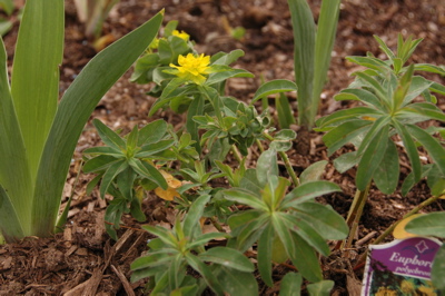 Last fall’s mystery plant, which I identified as a Euphorbia, has risen again. Its leaves are limier and its bracts are yellow. (Hmm, I guess this one is not Euphorbia ‘Rubra‘ or ‘Excalibur’, as I speculated previously. )