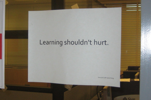 I like the idea of this sign (and certainly it’s more interesting than most we see everyday!) but I disagree with its primary message (though not the “Love yourself. Savor living” part). I’m more of the mindset of the REM song/blog post title. Learning often hurts. Sometimes a lot. I don’t know; maybe it shouldn’t. And it certainly doesn’t have to. I usually wish it didn’t. But learning does hurt, suuummmtiiiimes (that was meant to represent Michael Stipe’s voice).