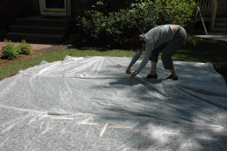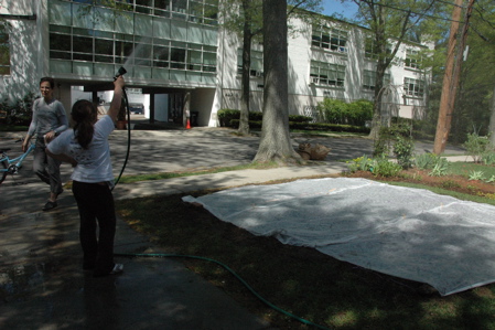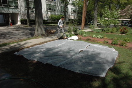 6. Cover the bed loosely and evenly with landscaper’s cloth. Overlap rows slightly. Pin down the cloth along the four sides with the landscaper’s cloth pins. Use clothespins here and there to keep the rows of fabric attached to each other. I had to tiptoe among rows to do this — it was like playing a version of Twister. (This important step is to prevent crows, or, in my neighborhood, squirrels, from eating all the seeds you just planted!)