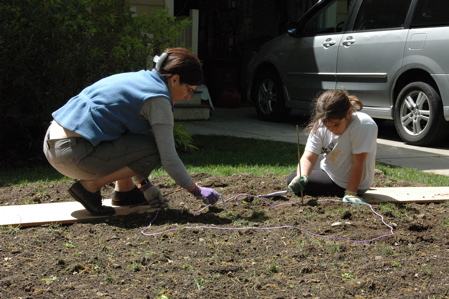 3. Using a stick or your index finger, press seeds into the ground about 6″ apart and to the depth specified on the seed packet. (I noticed that big seeds, like the Mammoth Gray, get planted to a depth of 1″, while the little ones only .25″.) Use a plant marker to identify the seeds planted in that roped-off area. (In photo, notice how Grace and I floated some old pieces of MDF on the dirt to kneel on as we planted. Otherwise, we would have pitted the bed with deep knee or foot prints.)