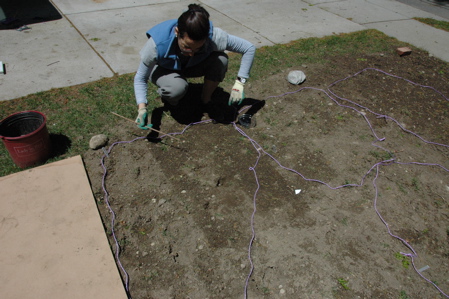 2. Cut cord into 10′ or so lengths and tie ends so you have a loop. Drape the first piece into a small, uneven pod- or pie-shaped swath on the dirt to indicate where you’ll plant seeds from one packet.