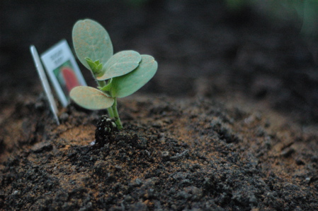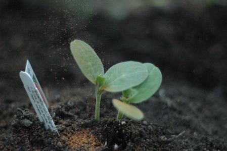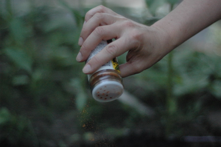 At the urging of Grace, I planted one watermelon seedling, in a little hill I made in a leftover patch among the sunflowers. It looked so attractive, a bit of green surrounded by black dirt, and it occurred suddenly to me how attractive the squirrels would find the bare dirt. So, after some thought, I sprinkled on them some cayenne pepper, which looks, in these photographs by Eli, like fairy dust.