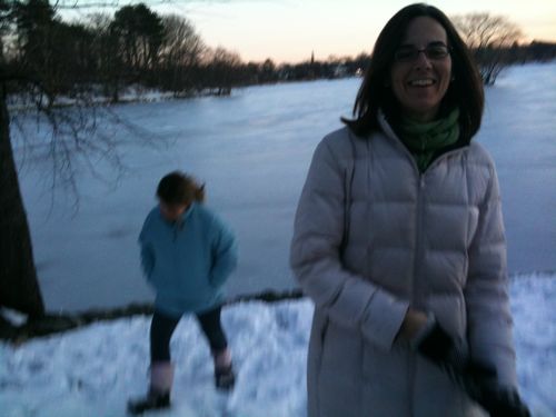 Solitary joggers ran by intermittently. We picked up the pace, wanting to make it around before it got dark, and passed the boathouse, the metal rowboats upturned on a rack.Ā  Grace looked out at the pond and took pictures of duck tracks on snow.