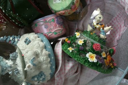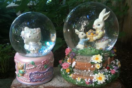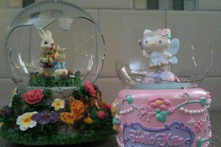 Update (July 19, 2010): I sent the broken snow globes to Toby Gentile and Bob Overholser, and a couple of weeks ago we got them back, beautifully repaired, right down to the little transparent hearts in the “snow” of the Hello Kitty piece.