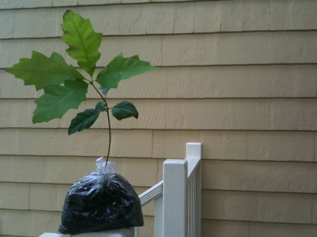 In April, digging around in the yard, I slipped a sprouted acorn out of the ground, put it in a plastic sandwich bag with some damp soil and mulch, and sealed it with a twist. My intention was to mail it to a friend’s child, as a surprise. I forgot. And yet it has been doing well on its own, sitting on the shelf attached to the gas grill, waiting for me to make up my mind what I’ll do with it, and growing.