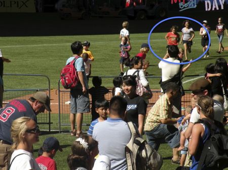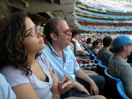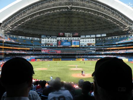 The entrance into Rogers Centre is impressive. We walked from the outside through the turnstiles and, boom, onto an open deck that looked out onto the field. Wow. It was a great game: the Red Sox led for 8 innings, and then, in the 9th, with the score at maybe 5 to 2, Papelbon choked and the Blue Jays turned it around. Four sweet runs after a long spell of nothing. At sports moments like that, team alliances matter nothing to me. I clapped for all the Blue Jays’ excellent hits and stolen bases. Eli remarked, “Only sports can make you feel like that.” It was Camp Day, and everyone 14 and under got to run the bases after the game, so Lydia, Grace, and I went down on the field and participated in the orchestrated fun.