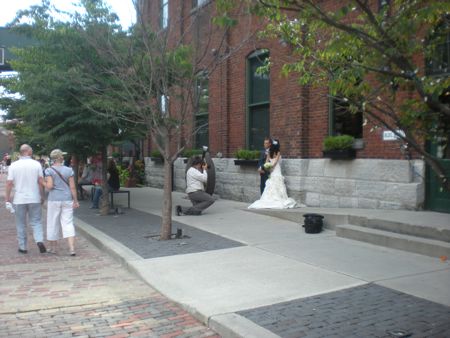 Instead, I complied with Grace’s plans for us: a café writing date back at the Distillery District. She packed up her notebook pc, and I made sure I had my bound notebook and a camera, and we cabbed down there. At 4pm on a Saturday afternoon it was far more crowded than on the weeknight we went as a family. There were brides and their entourages — several of them — walking languidly across the cobblestones. Photographers followed. I wondered aloud if they were bride models, and I took pictures of them, to Grace’s embarrassment. I retorted, “Grace, they are posing for photographers in a public place! If I want to take their pictures, I will!” One of the street vendors told me, huffily, that they are real brides. “They all love to have their pictures taken against the stone walls, and especially near that old truck,” he said and pointed with his nose.