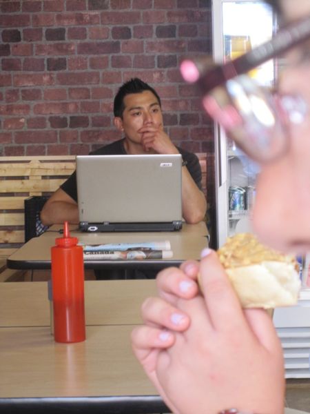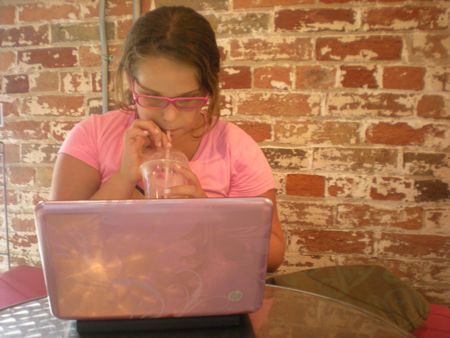I couldn’t persuade Grace to sit down in Balzac’s Coffee, and we end up in some smoothie place. (There was no such thing, or word, as “smoothies” when I was a kid.) I wrote on paper and Grace online.