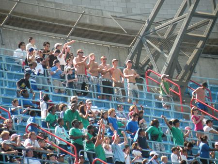 Way up in the nosebleed section, these guys made it into a lot of crowd shots on the big screen. Their appeal? Dancing, shirtless, in unison. We liked them.