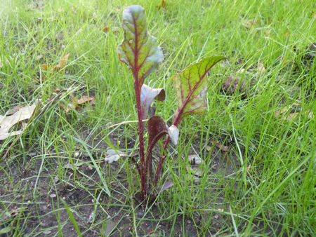 Grass is similarly sprouting in both the lime- and compost-treated areas. There is also, surprisingly, some additional species growth in the area with compost. Ah, vegetable seedlings to be exact.