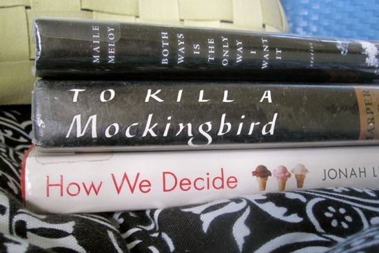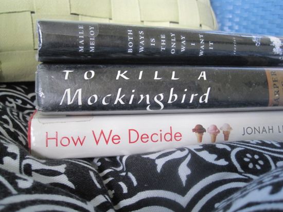 And the next three, one after the other, were Both Ways Is the Only Way I Want It (stories), by Maile Meloy; To Kill A Mockingbird, by Harper Lee (because I had never read it); and How We Decide, by Jonah Lehrer. Yes, yes, and yes.