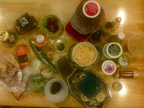 What’s left? Mustard, pickles, mayo. Lots of 6-8 oz. containers of flavored yogurt. Carrots. Oranges. Romaine lettuce. Celery. One lime, and one jalapeño pepper. Eggs. A bottle of Prosecco. Maple syrup. Butter. Goat cheese. Brie. Laughing Cow cheese. Shredded mozzarella. Apricot preserves. Fig jam. Hummus. Four cans of diet coke. Lots of Asian sauces in bottles, plus soy sauce. Worcestershire sauce. Sesame oil. Milk. Lemonade. Insulin.