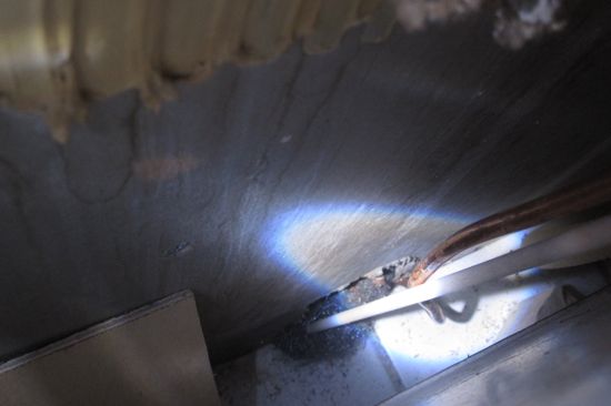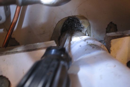 I went back in, this time armed with screwdriver and wads of steel wool. The holes at eye level were easy to fill. The holes down at the seam between wall and floor were a challenge and the screwdriver too short. In a pinch, a long s’more stick (unused and leftover from summer) worked. I attacked the cracks from two angles: (1) looking down on the cracks from inside the cabinet and (2) looking horizontally at the cracks as I lay on the floor, having taken the toe kick off from under the cabinet.