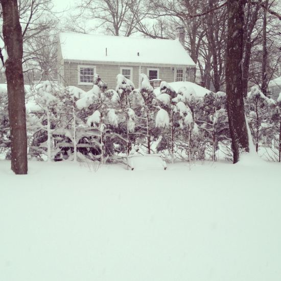 So much was blanked out in this Blizzard of ’13. Even my neighbors’ yard, which abuts ours, became softer and more lovely to look at in the snow. The dying cypress hedge punctuates the view, indicates where we end and they begin. Last summer, the dying cypress hedge, dried and brittle looking, was only an eyesore and the topic of repetitive unresolved conversations with the neighbors, who own the hedge and don’t want to cut the shrubs down. Isaac and Olga want to leave the hedge there and plant other things in front. Bamboo, for example. In the meantime, to get privacy from us, they have leaned old wooden pallets against the dying hedge and planted junk vines that they have draped on the dying branches. On our side, I have done no more than keep it clean and trimmed. A fence is called for, but expensive.