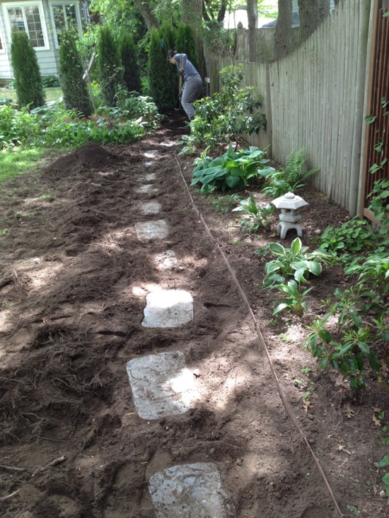 4. Stones from Home Depot in Watertown are eased into the loosened dirt. We bought 18 for $8 each. This part of the project is a pain. It’s a lot of fiddling to make something that looks homemade and yet is still sturdy. Oh, and the stepping stones, one inch thick, are heavy.