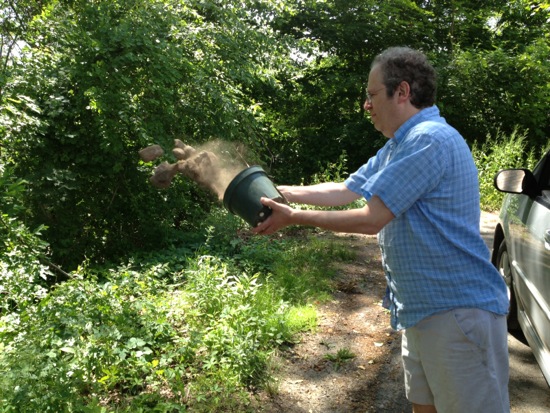 8. I have the idea that we can discard our stones at the woodsy, rocky sanctuary behind the elementary school. A stone isn’t really garbage: it’s part of the geography. Jimmy loads up the car and drives them over there during the time I plant the perennials. (Eli goes along as photographer.)