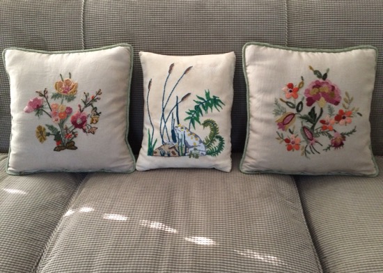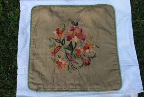 Last weekend, when I brought Lydia and her belongings to college and helped her with some initial unpacking, I came across a thrift-store dress I had altered for her last summer. As I handed it to her, I remarked with some wistfulness, “I’m just realizing that I didn’t do any sewing or mending this summer.” Perhaps that’s what led me, a few days later, to tackle the cleaning and mending of some old crewel work pillows I saved from the trash bag at a friend’s deceased mother’s house.