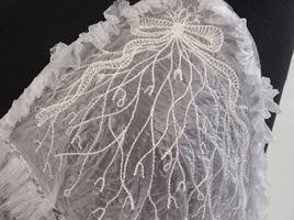 Look at the machine-sewn detail on the bodice. She calls this sexy, ghostly work Trousseau (Negligee #1). Inspired equally by the body and artifacts of medicine, Splan also paints in her own blood on watercolor paper, tracing the patterns of neuroanatomical forms. She sews lace doilies based on the structures of viruses. She has knit a blood-filled scarf from vinyl i.v. tubing and photographed it. See for yourself — more of Laura Splan’s fascinating work is here.