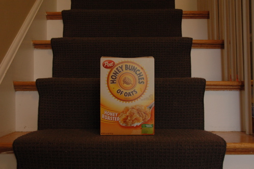 Cereal box on stairs