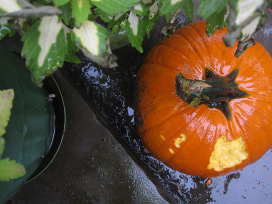 This morning, the ground was wet, but there was a lull in the rain. Under Winston’s supervision, I made a watering can from an empty water jug: I heated the tip of a brad nail with a BIC® lighter and pierced the jug lid many times.