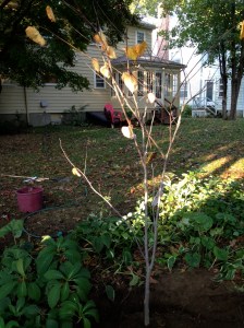 On Sunday, however, I had the feeling of planting a tree as being an act of capitulation and acceptance. This is where I live, this is our tiny corner, and this is our dirt. Bringing a tree into the yard seemed like a re-commitment ceremony, a signal that I embrace everything my habitat is and everything it is not.